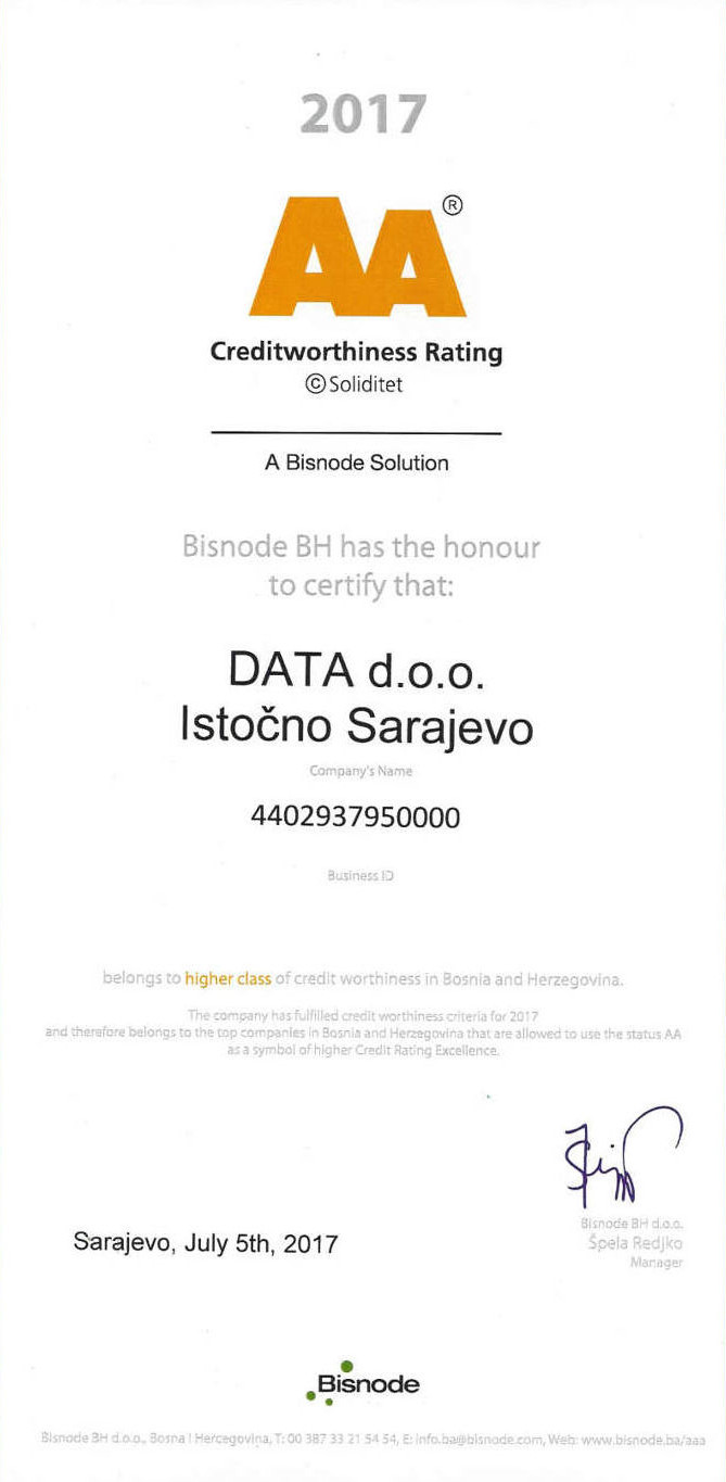 DATA doo je nastala kao produkt ideje da se na BIH tržištu objedine tehničke usluge i distribucija marketing materijala na jednom mjestu. Kvalitet repromaterijala, njegova dostupnost, cjenovna prihvatljivost, servis štamparskih mašina uz konstantne konsultacije sa tehničarima su pionirske usluge u inicijalnoj ponudi agencije i našeg predstavljanja na tržištu.